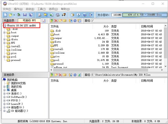 在UtralISO主界面中点击文件—打开—选择你之前下载的ubuntu镜像文件。选中红框区域。