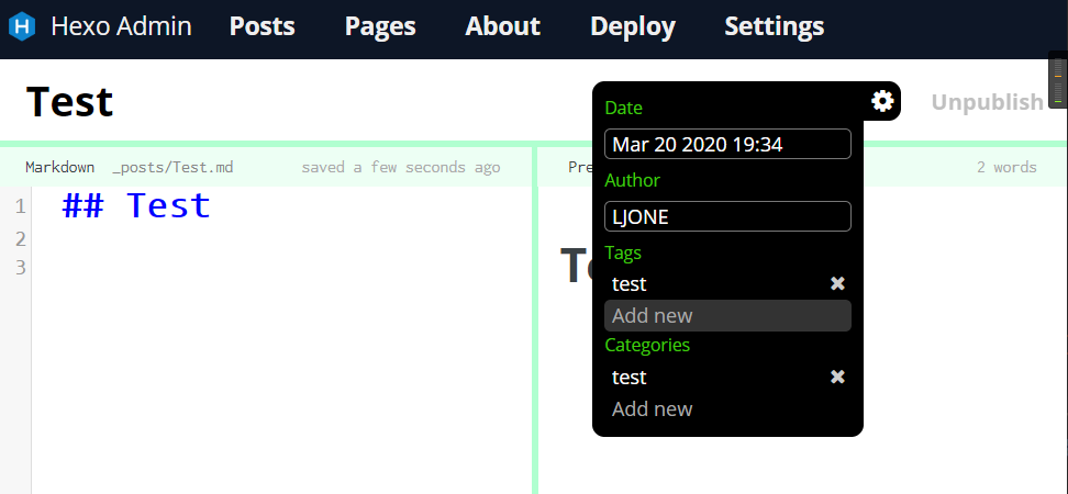 点击右上角的 齿轮 标识可以设置文章的 Date、Author、Tags、Categories等信息。