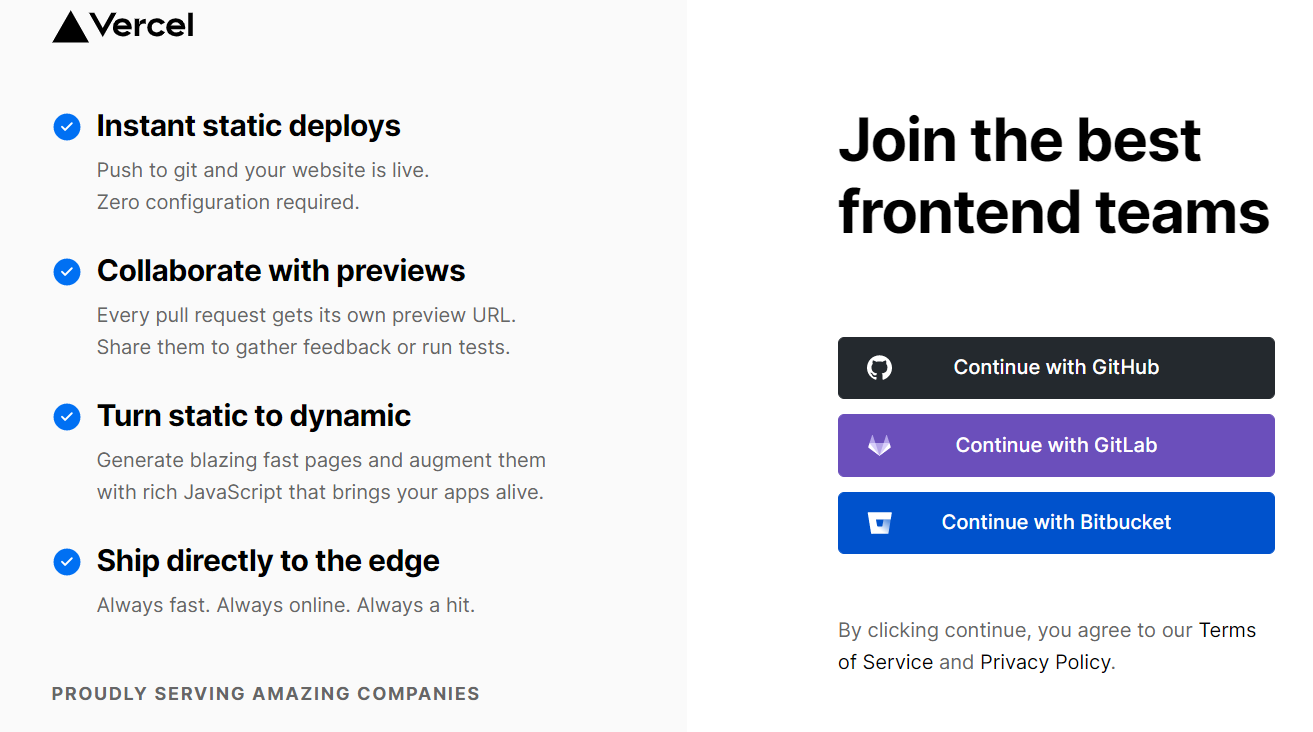 原名 Zeit,服务器在美国,在港台有 CDN 节点,提供自定义 xxx.now.sh 和 xxx.vercel.app 域名,且支持免费绑定个人域名,同时可以解决百度爬虫问题。最大的好处就是可以绑定 GitHub 账号,由 GitHub 托管Hexo博客源码,Vercel 导入博客源码,当检测到仓库改动后自动进行部署。