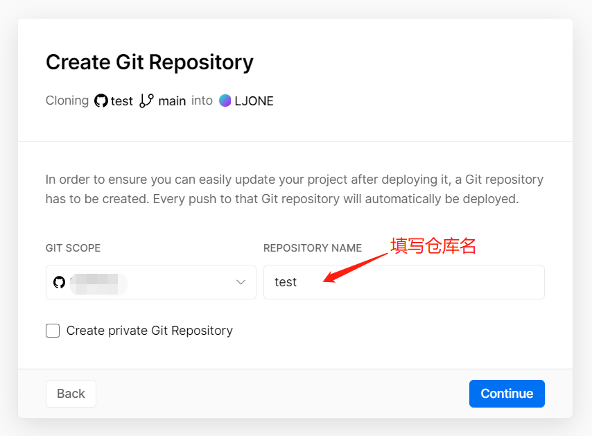 填写仓库名,点击 Continue,创建Vercel仓库用于存储导入的文件。