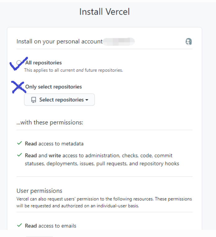 过程中会弹出如下对话框,此图截取自参考链接 3 的博主文章,他给的建议是All repo,但我选择的Only,只不过再导入 GitHub 其他项目时需要重新走一遍流程,可自己根据情况选择。