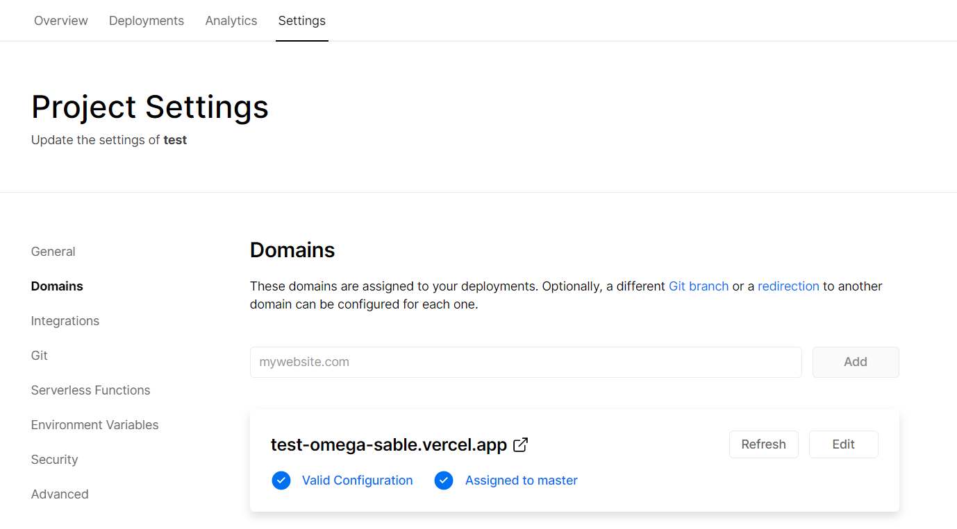 进入项目设置,找到 Domains,在 Add 前面的输入框内输入要自定义的域名地址,再点击 Add 即可。