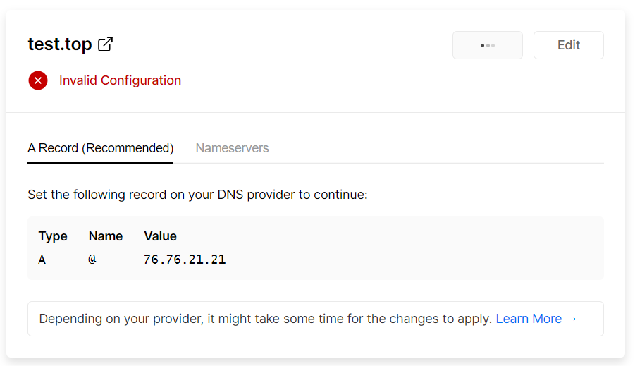 添加 CNAME 类型,主机记录@,记录值为cname.vercel-dns.com。