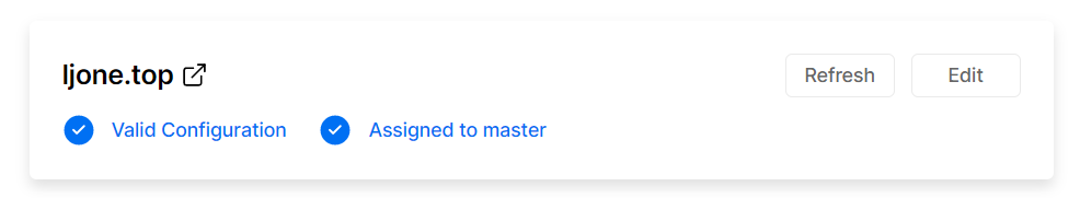 添加完成后,稍等片刻便会在自定义域名下方显示通过的提示,有时解析正常 仍然显示 Invalid Configuration,只要可以通过自定义域名访问博客便可忽略。